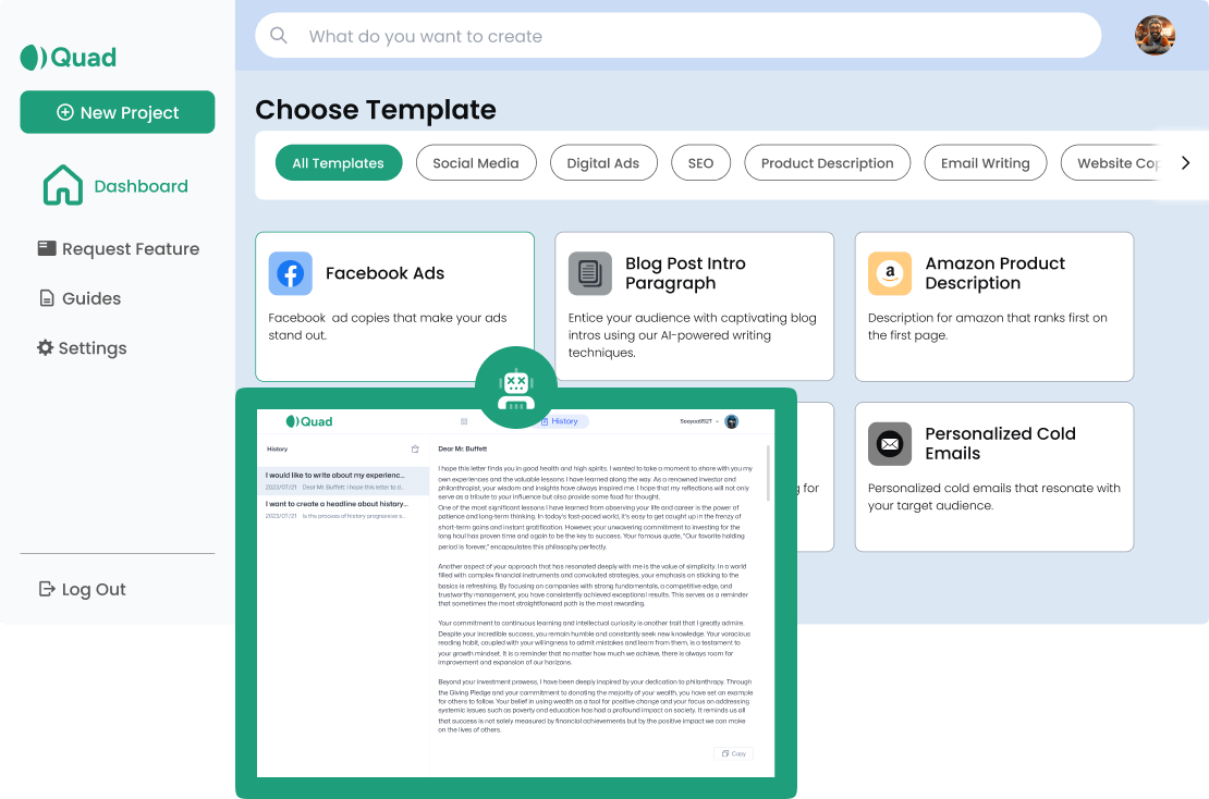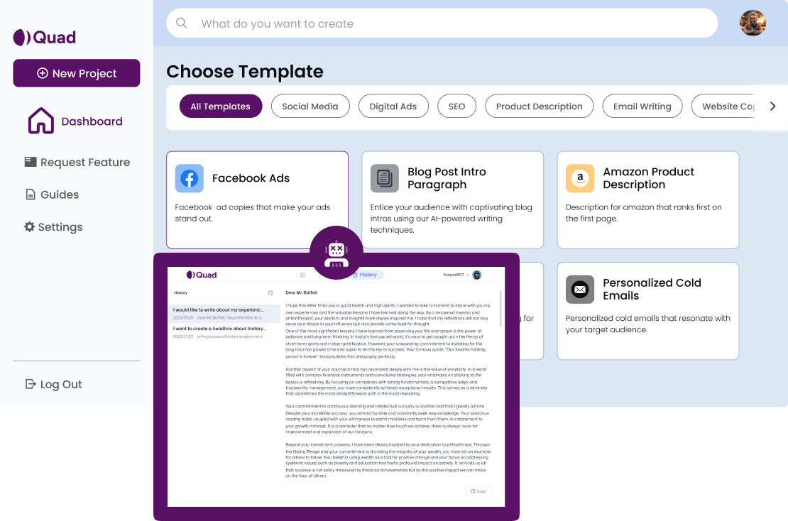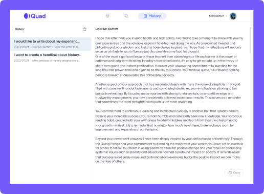 At Quad we're passionate about harnessing the power of artificial intelligence to transform the way you create content. With our cutting-edge technology and intuitive platform, we're here to revolutionise your writing experience.